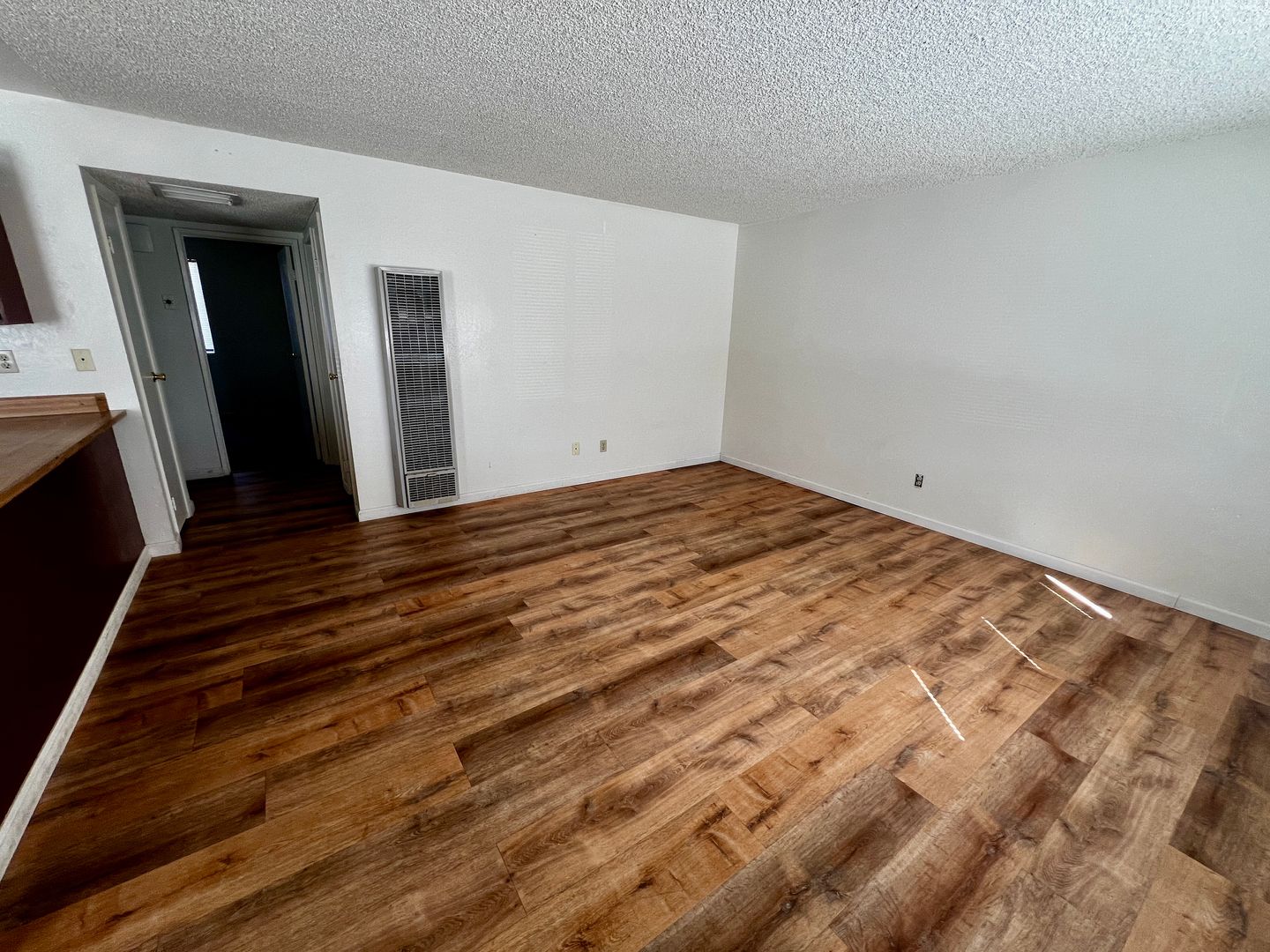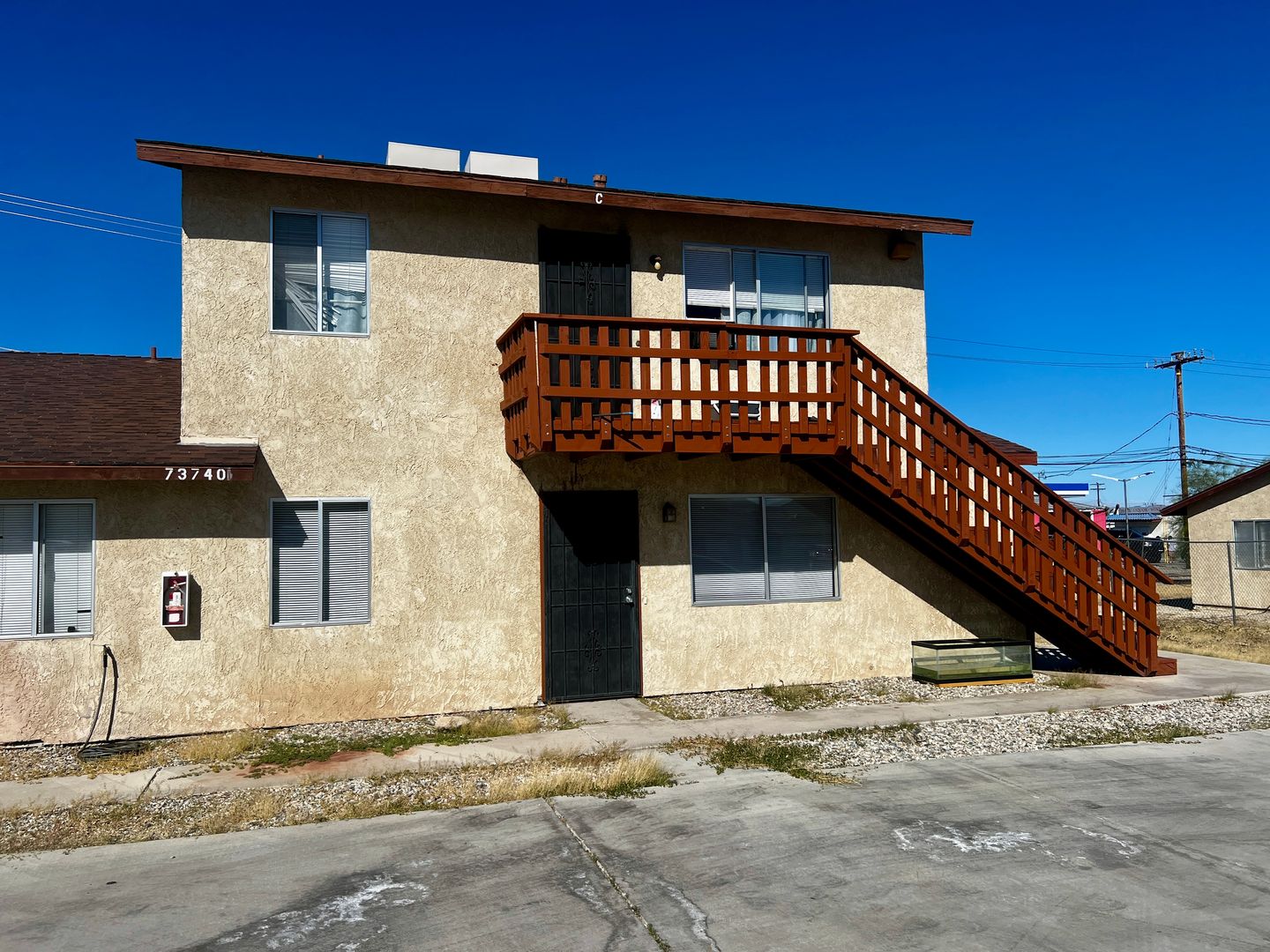 Welcome to this charming two-bedroom, one-bath apartment conveniently located near town with quick access to public transportation, making commuting to the 29 Palms Marine Base a breeze. The property is also close to Tortoise Rock Casino and the Joshua Tree National Park, offering both convenience and leisure opportunities nearby. Inside, you’ll find updated wood laminate flooring throughout the kitchen, living room, bathroom, and hallway, while the bedrooms feature cozy carpeting. Fresh interior paint and an updated bathroom with a modern cabinet and full tub/shower enclosure add to the home’s appeal. Both bedrooms are well-sized with wall-to-wall closets, and there is additional storage available in the hallway closet. Outside, the unit includes a small fenced backyard, with water and trash service included. For added convenience, an on-site laundry room is available to residents.